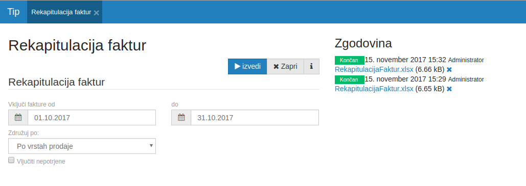 Rekapitulacija je zgrajena tako, da nam iz pridobljenih podatkov kreira Excel-ov dokument. Novo kreiran Excel-ov dokument se pojavi v razdelku 'Zgodovina'. Ko kliknemo nanj (na ime dokumenta - v danem primeru kliknemo na 'RekapitulacijaFaktur.xlsx'), se nam dokument odpre v Excel-u (če imamo nameščen Microsoft Office) ali pa pač v kateri drugi aplikaciji, ki je nastavljena kot privzeta za dokumente xlsx.