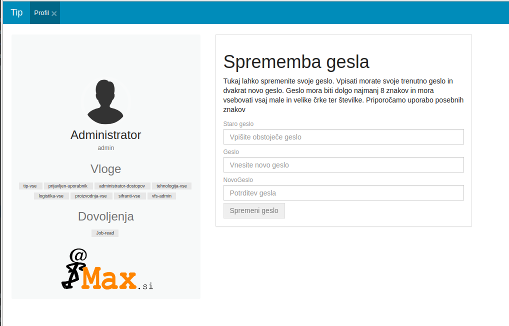 Geslo si vsak uporabnik določa sam v nastavitvah lastnega profila. Do profila pridemo s klikom na ikono čisto spodaj v osnovnem meniju aplikacije. Pridemo v profil uporabnika. Tukaj si zamenjamo geslo tako, da najprej vnesemo trenutno geslo v polje obstoječe geslo, potem pa v polji novo geslo in potrditev gesla vnesemo novo geslo. S klikom na spremeni geslo je novo geslo nastavljeno. Odjavimo se s klikom na ikono spodaj levo v osnovnem meniju aplikacije.