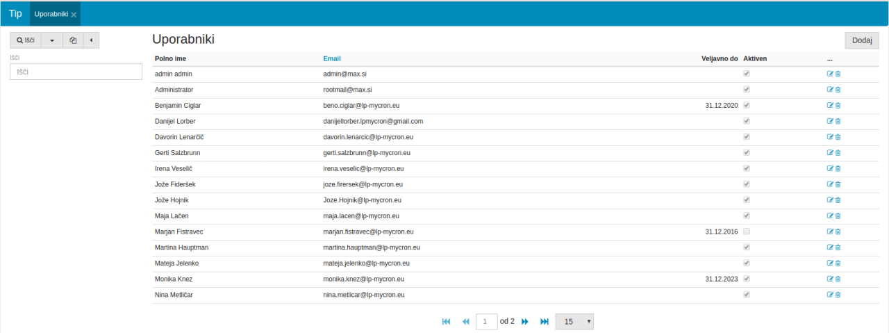 Uporabnike urejamo s klikom na uporabnika v seznamu, Novega uporabnika dodamo s klikom na gumb Dodaj.
