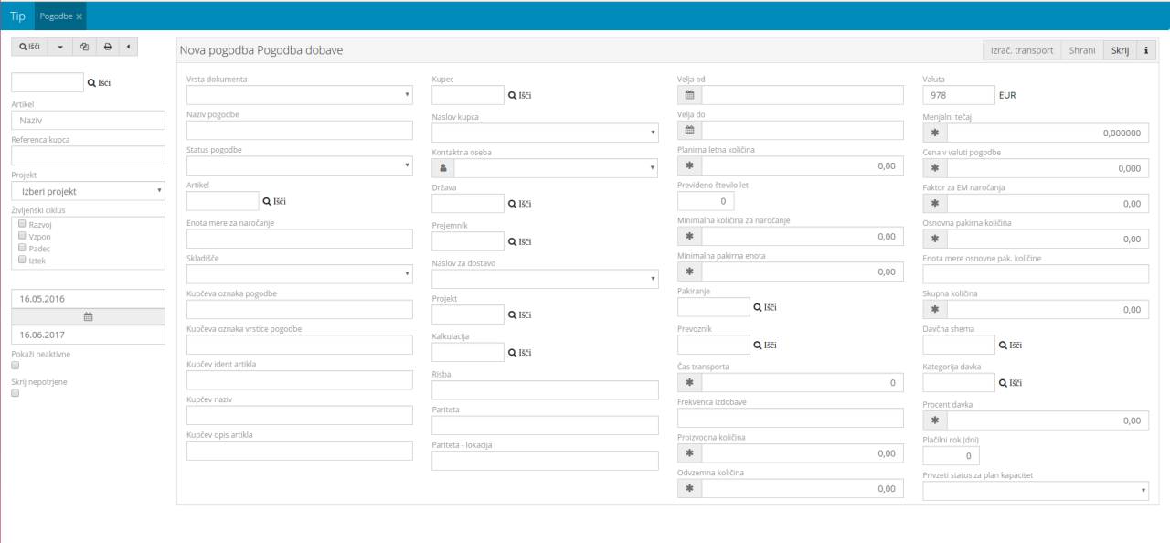 | Vrsta dokumenta | Vrednost izberemo iz seznama tipov dokumenta, določa vrsto dokumenta za pogodbo, skrbi tudi za številčenje pogodb |