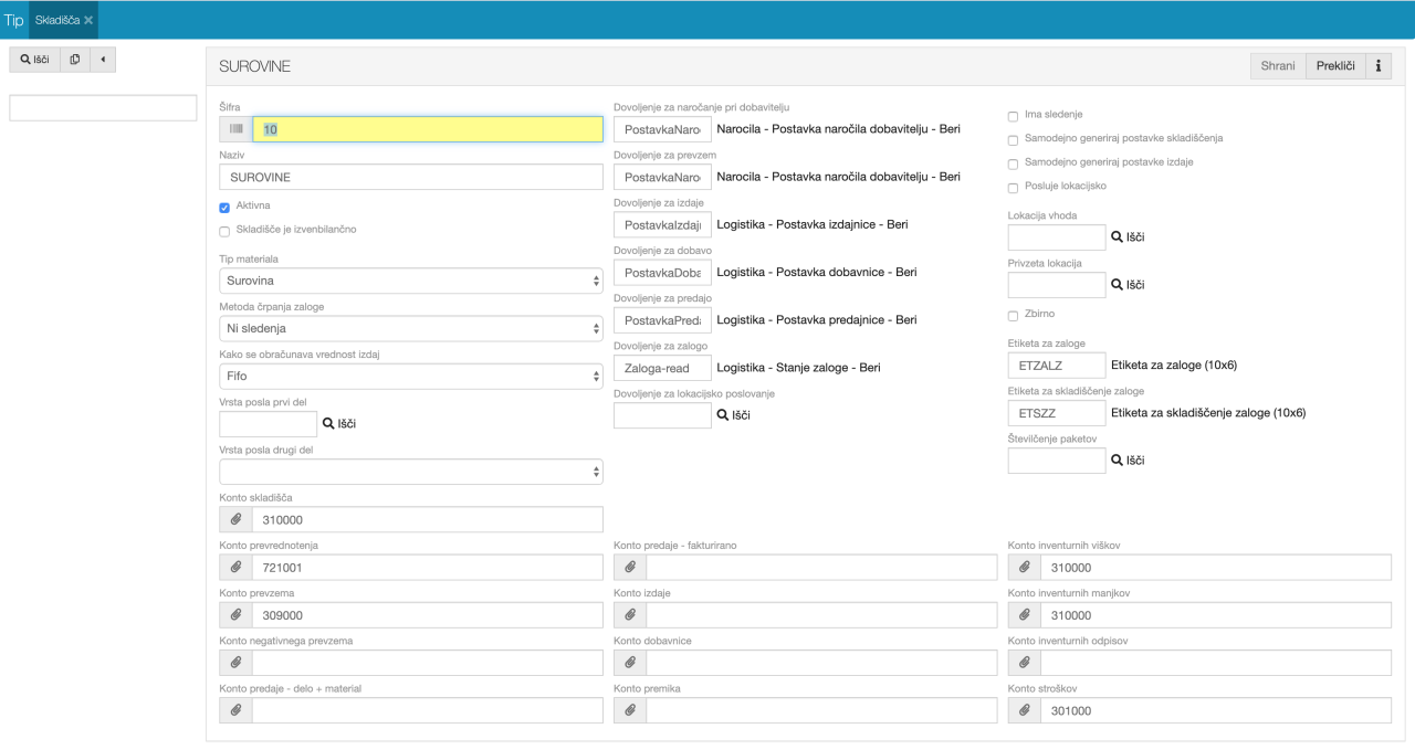 | Dovoljenja | Za posamezno skladišče lahko ločimo kdo ima dovoljenje za posamezne dokumente na skladišču. Trenutno imamo definiranih pet dovoljenj: za prevzem, za izdajo, za dobavo, za predajo in za zalogo. |
