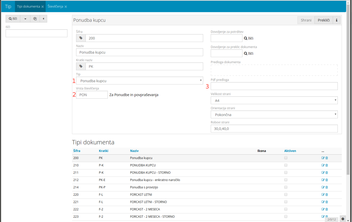 V seznamu Tip dokumenta imamo še dodatne tri gumbe (1,2,3), ki so namenjeni upravljanju številčenj. Številčenja so opisana v podpoglavju Številčenje.